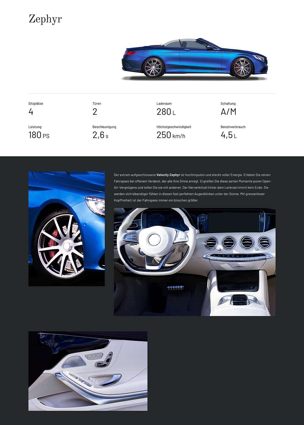 Putting this one together wasn’t easy, since I only used photo that were free and unlicensed. Especially the interiors and having a similar looking page for each of the car models was hard to do.
